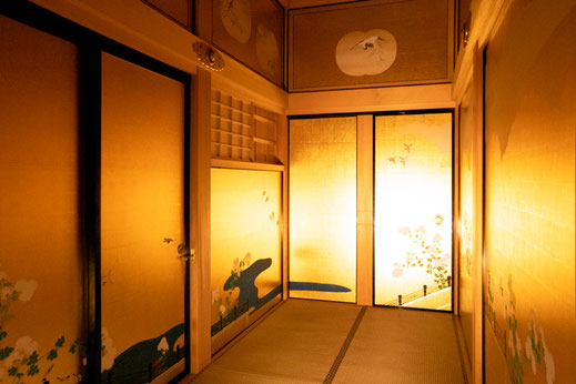 シンプル且つ繊細、大胆な構図で描かれ、当時と同じ技術と材料で再現された、美しい紅白の菊と流水が描かれた金碧の障壁画をご覧いただけます。